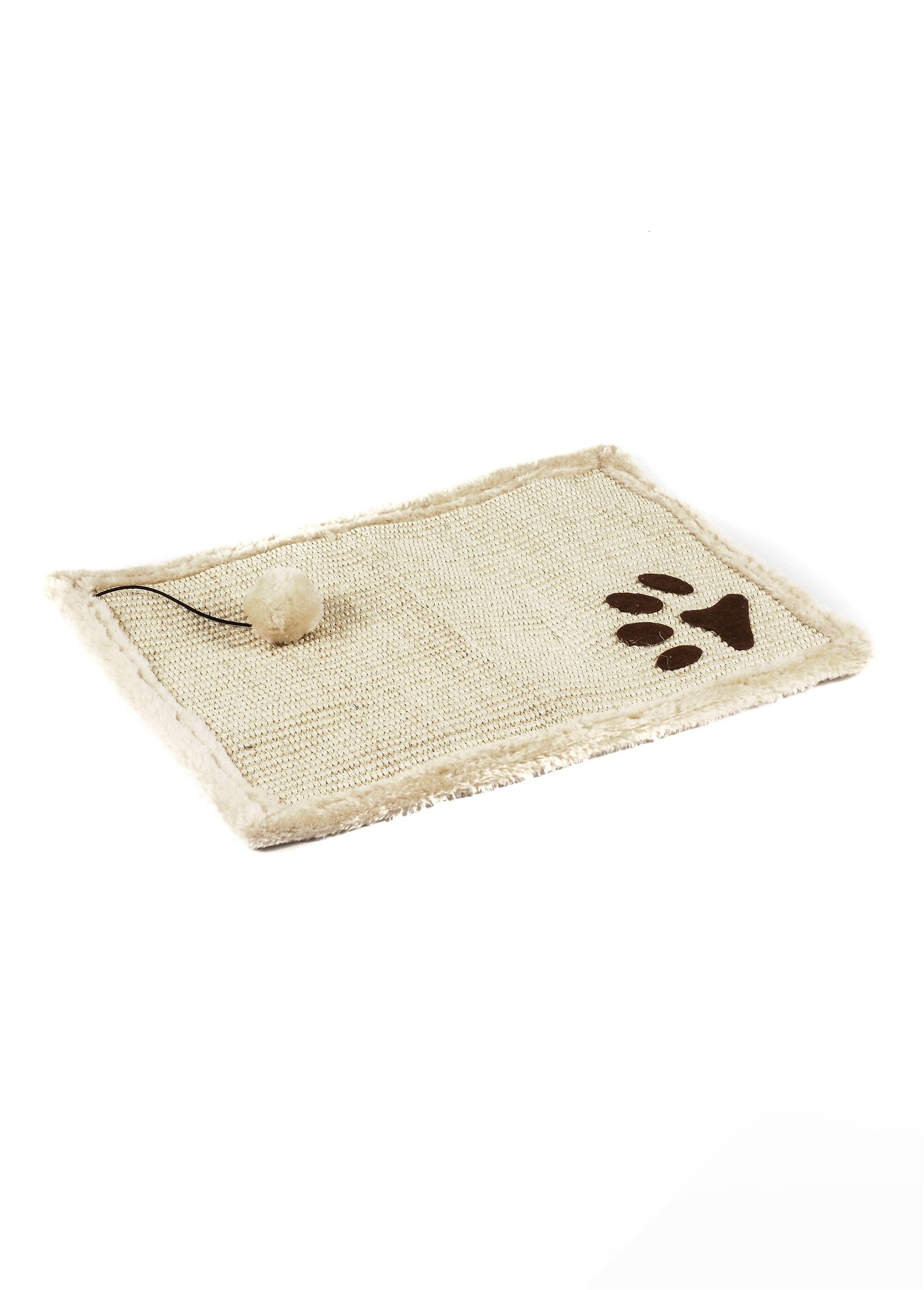 Esta alfombrilla rascadora de doble cara de sisal y pelo beige es el accesorio multifuncional perfecto para su gato. Por un lado, el resistente sisal permite a su felino arañar en cualquier momento, protegiendo sus muebles de arañazos. Por otro, la suave superficie de pelo proporciona un lugar cómodo para descansar. Se suministra con un juguete de pellets, que estimulará a su gato y le animará a utilizar la alfombrilla con regularidad. Diseñada para ser duradera y resistente, esta alfombrilla es a la vez un eficaz rascador y una acogedora cama para su compañero.