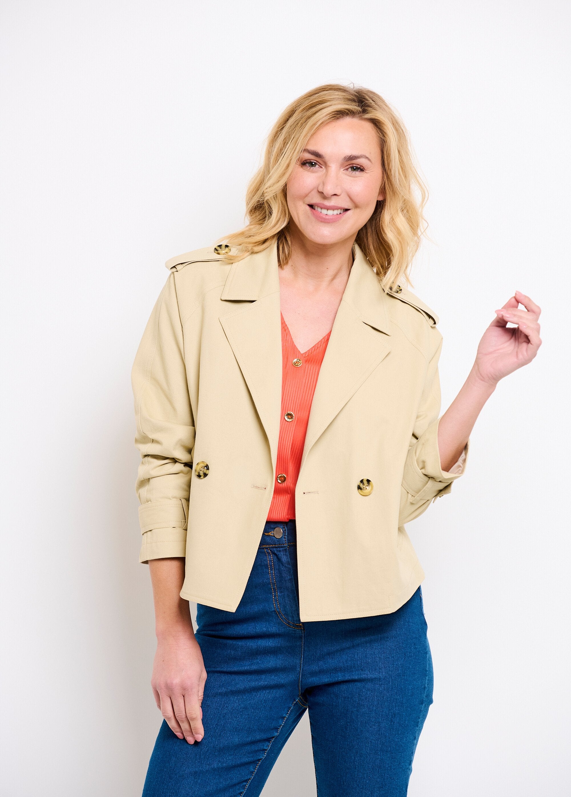 Con su asertivo estilo trench, esta versión corta está fuera de lo común. Debajo del cuello sastre tiene doble abotonadura y 2 bolsillos inclinados con ribetes anchos en la parte delantera. Destaca también por su volumen raglán y sus trabillas abotonadas en hombros y muñecas. Pestañas ajustables debajo de las muñequeras. Totalmente forrado.