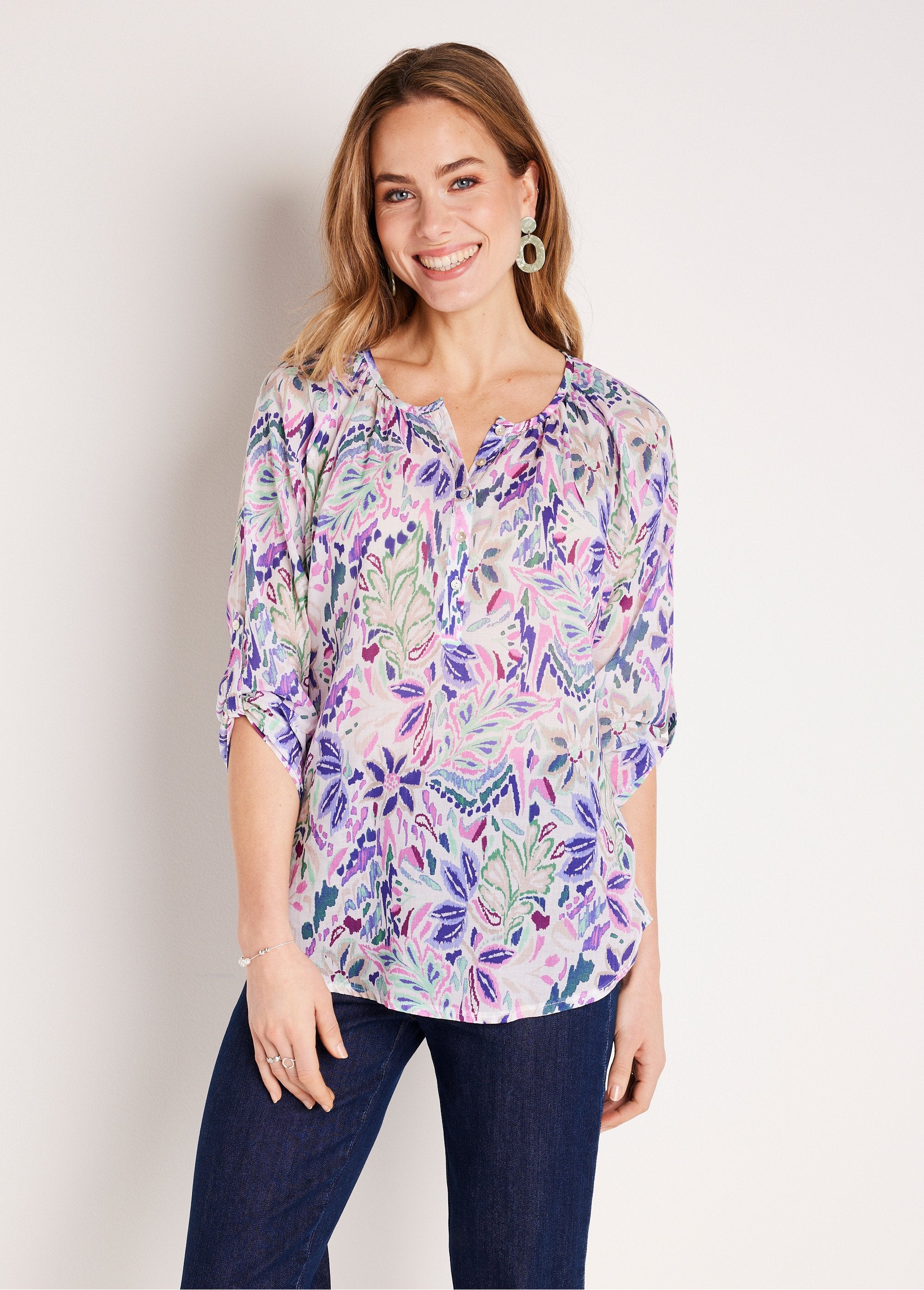Con su estampado floral y su corte adecuado para tallas grandes, la túnica garantiza estilo y comodidad. Los frunces bajo el escote redondo resaltados con un bies y las sisas raglán le dan el volumen necesario. Sus mangas 3/4 resaltan especialmente los brazos. Pequeña tira de botones. Línea larga con base redondeada.